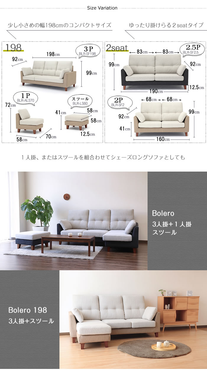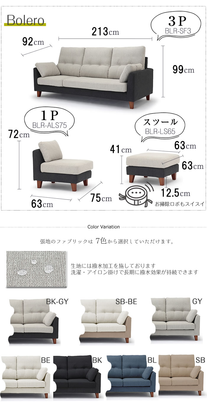 ■カラーを7タイプからお選びください カラーによってはお届けまでお時間頂戴する場合がございます 【サイズ】幅630×奥行630×高さ410(mm) ■ソファ仕様 【本体】木枠・Sバネ・ウェービングベルト・ウレタン 座クッション:新耐久ウレタン3層、化繊綿 【張地】ポリエステル100%(ウォッシャブル生地) 【脚】木製(高さ12.5cm)/ブラウン色(樹脂製フット付き) ■テフロン撥水加工を施したファブリックでカラーは7色対応 ■フルカバーリング仕様でご自宅で手洗い可能なウォッシャブル生地 ■脚の高さが12.5cmあるのでお掃除ロボも使えます ■樹脂製フットが付いていますので木脚を外してロータイプソファとしてもお使いいただけます ■3人掛、1人掛を組み合わせてシェーズロングソファとしてもお使いいただけます ■お好みの組み合わせで楽しめるリビングソファです ●ボレロ/3P・1Pはこちら ●ボレロ/コンパクト198/3P・1Pはこちら ●ボレロ/コンパクト198/スツールはこちら ●ボレロ/2seatはこちら ●ボレロ/セットはこちら ●ボレロ/コンパクト198セットはこちら ●ボレロ/替えカバーはこちら MKCD:1255 |