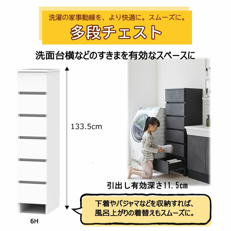 ■チェスト:引出し6段 【サイズ】幅300~800×奥行320・420・520×高さ1335(mm) 【主材質】プリントコート紙化粧繊維板、強化紙、ポリエステル樹脂化粧繊維板、オレフィン樹脂化粧繊維板 【引出し有効深さ】11.5cm ■幅は30~80cmの範囲で1cm単位で指定してください ※設置場所の実寸よりも余裕をもって1cm引いたサイズでご指定ください ■カラーをお選び下さい ■チェストにタオル類や下着、パジャマなどをしまえれば、お風呂上がりの着替えがスムーズになります ■本体部分の色について... ●ホワイトとマットホワイトの本体(側板や棚板)はホワイト単色、シルクベージュとモードグレイの本体はライトグレイ単色、艶消しブラック、モードブラックの本体はブラック単色となります ●ナチュラルな艶消し仕様の木目調各色は、本体も同色木目調です ■ホルムアルデヒド放出量が極めて少ないF☆☆☆☆等級の素材を使用 ■お届けしてすぐに使える完成品です ■板色見本をご用意しています。ご希望の方はお問い合わせくださいませ ※オーダー品につき、お届けまで6週間程お時間頂戴いたします MKCD:0023 |