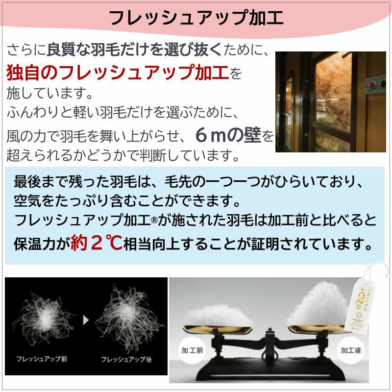 ■2枚合わせの羽毛布団です 【サイズ】 SL/シングルロング 1500×2100(mm) DL/ダブルロング 1900×2100(mm) QL/クイーンロング 2100×2100(mm) 【詰め物】ウクライナ産グースダウン93% 【詰め物量】 SL/シングルロング 0.7+0.3kg DL/ダブルロング 0.9+0.4kg QL/クイーンロング 1.0+0.45kg 【側生地】ポリエステル85%、再生繊維(リヨセル)15% 【生地カラー】ピンク ■バイオアップ加工・・・選別した羽毛に「加湿・乾燥」と「冷却除塵」を施す加工。羽毛本来のチカラを引出し、より暖かく軽くクリーンな羽毛になります ■バイオアップ加工を施すことで、羽毛布団の埃の量が約26%減少します ■良質な羽毛だけを選び抜くために、独自のフレッシュアップ加工を施しています。ふんわりと軽い羽毛だけを選ぶために、風の力で羽毛を舞い上がらせ、6mの壁を越えられるかどうかで判断しています。最後まで残った羽毛は、毛先の一つ一つがひらいており、空気をたっぷり含むことができます。フレッシュアップ加工?が施された羽毛は、加工前の羽毛と比べると、保温力が約2℃相当、向上することが証明されています ■鬼怒川水系の良質な天然地下水で泡立ちがよく洗浄力も高まる、最も羽毛の洗浄に適した水である超軟水を使用。水の中に含まれる不純物が0なので、羽毛に摩擦をかけづらく、やさしく丁寧に洗えるのでふっくらとしたボリュームへ ■さらに0.001mm未満の細かな泡『ウルトラファインバブル』で洗浄することで羽毛の毛先のわずかな隙間にも入り込み、超微細な汚れも見逃さない。ニオイのもとになる油脂分をきれいに落とし、ふっくらと軽い仕上がりに。そのため、長く良い状態でご使用いただくことができます ■洗浄・選別した羽毛を、高温スチームで広げることでより細かく原毛の段階で付着していた不純物などを取り除き、より混じりけのない あたたかく・軽く・クリーンな羽毛に ■側生地は羽毛ふとんのふっくら感を損なわない、リヨセル混の肌当たりのソフトな軽量生地を採用。吸放湿性に優れています ■羽毛の飛び出しを防ぐ:高密度で織った上で、織り目をつぶす「ダウンプルーフ加工」 ■側生地の西川基準 :西川では業界の約133%引っ張りに強い基準を持ち耐久性にもこだわっています ■一般的なキルトは長く使用するうちに片寄りが生じ、寒く感じる場所ができてしまいますが、西川独自開発の「ユニステークキルト」採用で羽毛をしっかり包み込み、ふっくら感を守るのであたたかさUP。快適な状態で長くご使用いただくことができます MKCD:0098 |