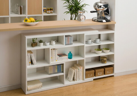 キッチンカウンター下の収納スペースは、自分にあった使いやすさを追求し、カスタマイズしましょう!扉タイプや引き出しタイプなど、好きなタイプを選べ、棚数も自由に選べるセミオーダーカウンター下収納家具を揃えております。