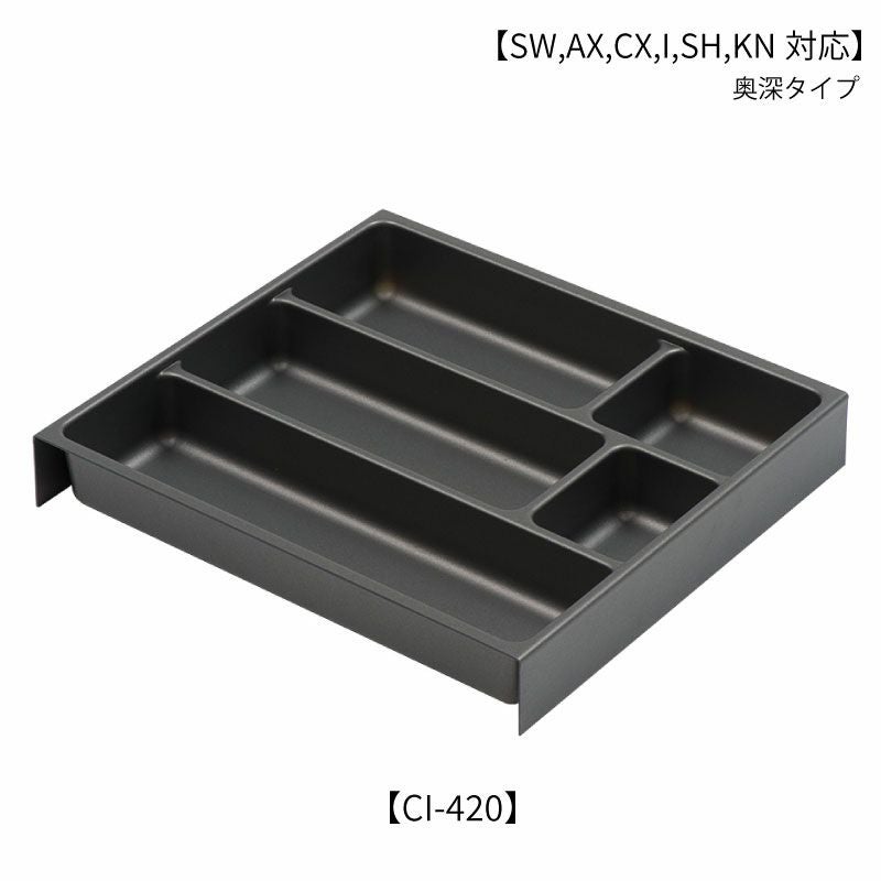 【サイズ】幅370×奥行410×高さ155(mm) カトラリートレイ SW、AX、CX、I、SH、KN対応 奥深タイプ 幅400mmの引き出しに設置できません。 キッチンツールを美しく分類して整理できる便利なトレイです。 拭き取りやすい曲面形状。 また、樹脂製ですので丸洗いができます。 MKCD:6480 |