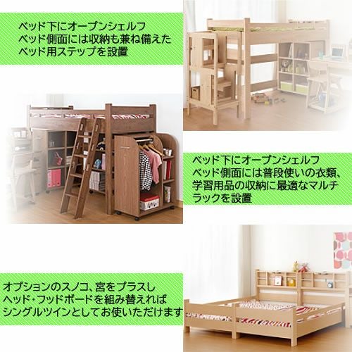 商品サイズ:大 ●送料について 【カラー】ウォールモカ 【サイズ】幅2126×奥行1052×高さ1540(mm) 【材質】ベッド/天然木集成材(ラバーウッド) スノコ/天然木杉材 ■ベッド宮にはLEDライトと2口コンセントが付いています ■床板は通気性に優れたスノコになっています ■床板下にはガタツキ防止のためサイドボードの中心部と両端を天然木の丈夫な棒で固定しています ■ベッドサイドボードの上部は取り外しができます ※サイドガードはローベッドとしてご使用のとき以外は絶対に取り外さないでください(転落しケガの原因となります) ■ベッド下の空間が大きな収納スペースに ■オプションのスノコや宮をプラスして2段ベッドにも ■オプションのスノコ、ミニハシゴをプラスして高さを抑えたL字型のレイアウトにも ■オプションのスノコや宮をプラスしてヘッド・フッドボードを組み替えればシングルツインにも ■※使用するマット・敷布団類の厚みの合計は、10cm以内の物をお使いください MKCD:1129 |