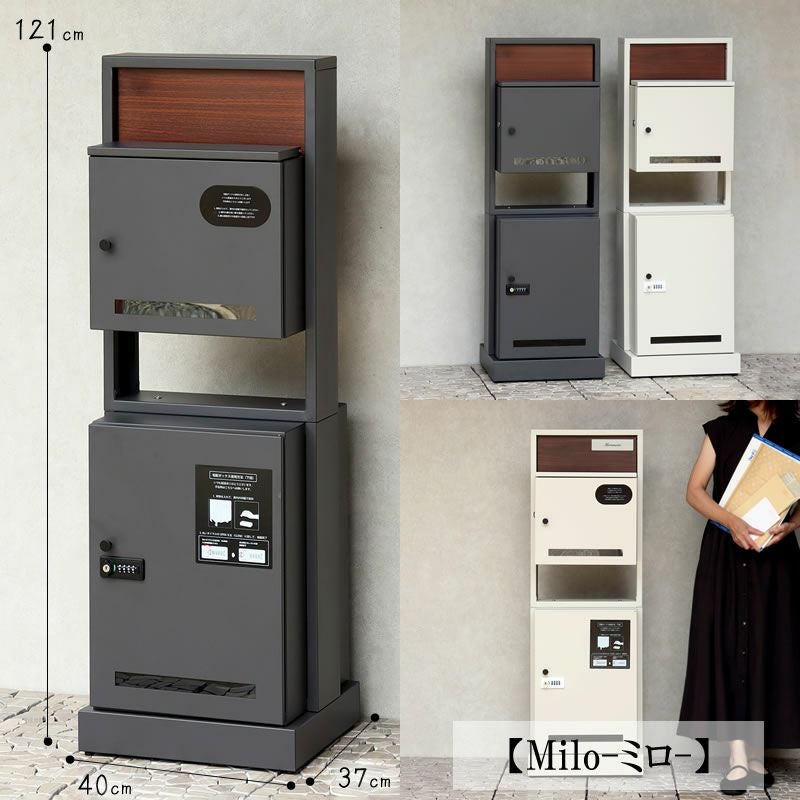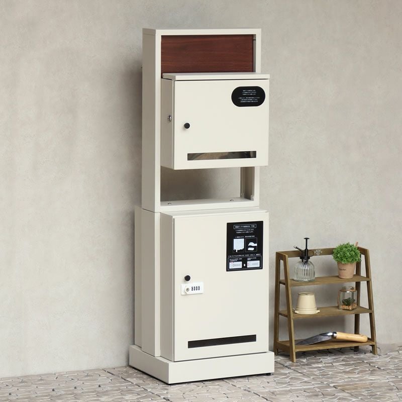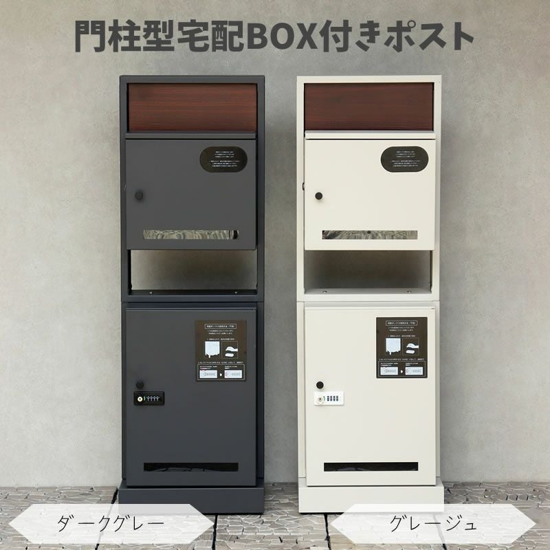 【お客様組立になります】 【サイズ】幅400×奥行370×高さ1210(mm) 【重量】18.7kg 【材質】金属(鉄)...ガルバナイズド処理を施しています 【塗装】紛体塗装 【カラー】ダークグレー/グレージュ 濃いグレーのダークグレーと、くすんだベージュのグレージュの2 色 ■上段投函口:幅298mm×奥行25mm ■上段取出口:幅317mm×奥行157mm×高さ270mm ■下段取出口:幅319mm×奥行333mm×高さ458mm ■郵便ポストとしても、宅配ボックスとしても使用可能なアイテムです ■門柱型の宅配ボックス付ポストの為、表札などを取付頂くと玄関周りが収まりが良く綺麗にまとまります(※ 表札は付属しておりません) ■最ポストと門柱を別々で用意する必要がなく、玄関周りを省スペースでご使用頂けます ■上段は、シリンダー錠付きなので、防犯面に安心(スペアキー1本付属) ■下段は、ダイヤルロックとシリンダー錠(ダイヤル解錠番号が分からなくなった際の緊急用)でドアの開閉が可能です ■下段のダイヤルロックは、鍵を施錠した際、鍵を解錠した際にダイヤル番号が" にリセットされ、設定したダイヤル番号の漏洩の心配がありません ■キー 上段用、下段用 、アンカーボルト、キーフック付印鑑ケース、宅配業者用の配達マニュアルが付属、お客様で追加でご用意頂くものはなく、すぐにご使用頂けます ■上部のパネルはブラウンの木目調で仕上げており、デザインのアクセントに ■印鑑ケースは2 個付属しており、上段も宅配ボックスとしての使用も可能 ■下段の宅配可能最大サイズは、約W31.9 × D33.3 × H45.8cm と、大きな宅配物も配達可能 ■ガルバナイズド処理を施しているため、錆びの発生がしにくい仕様 ※防水塗装は施しておりませんので、軒下や屋根がある場所への設置を推奨致します MKCD:6068 |
