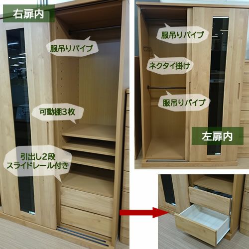 商品サイズ:大 ●送料について 【サイズ】幅1200×奥行590×高さ1900(mm) 【主材質】アルダー材 【カラー】NA ■環境・健康に配慮したF☆☆☆☆(低ホルムアルデヒド)製品です ■左側扉内/服吊り2段・ネクタイ掛け付き ■右側扉内/服吊り1段・可動棚板3枚・引き出し2段 棚板高さ調整17段・引き出しはスライドレール仕様 ■衣類も小物もすっきりたっぷり収納できます ■背面化粧仕上げ MKCD4200 |